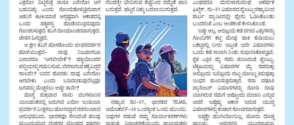 ಮೊನ್ನೆ ಶುಕ್ರವಾರ ನಾನು ಬೆಂಗಳೂರಿನ ಯಲಹಂಕದಲ್ಲಿ ಜರುಗಿದ ಏರೋ ಇಂಡಿಯಾ ಪ್ರದರ್ಶನ ವೀಕ್ಷಿಸಲು ಹೋಗಿದ್ದಾಗ ನನಗುಂಟಾದ ಅನುಭವವಿದು. ಭಾರತವೂ ಸೇರಿದಂತೆ ಹಲವು ಮುಂದುವರೆದ ದೇಶಗಳ ಲೋಹದ ಹಕ್ಕಿಗಳು ಬೆಳಗಿಂದ ಸಂಜೆಯ ತನಕ ನಮ್ಮೆದುರು ನಮ್ಮ ಕೌತುಕವನ್ನು ತಣಿಸಲೆಂದೇ, ರಂಜಿಸಲೆಂದೇ ಆಕಾಶದುದ್ದಗಲ ಹಾರಾಡುತ್ತಾ ಪಲ್ಟಿ ಹೊಡೆಯುತ್ತಾ ಸುಯ್ಯನೆ ಏರುತ್ತಾ ಜರ್ರನೆ ಇಳಿಯುತ್ತಾ ಥಟ್ಟನೆ ತಿರುಗುತ್ತಾ.. ಬಾನು ಕಂಪಿಸುವಂತೆ ಘರ್ಜಿಸುತ್ತಾ.. ಆಹಾ ಮಾನವನ ಕಲ್ಪನಾಶಕ್ತಿಗೆ ಅದನ್ನು ವಾಸ್ತವಗೊಳಿಸುವ ಚತುರತೆಗೆ ಶರಣೋ ಶರಣು. ಏನು ನೋಡಿದರೂ ಎಷ್ಟು ನೋಡಿದರೂ ಸಾಲದು… ಒಂದು ಜೀವನ ಸಾಲದು.
