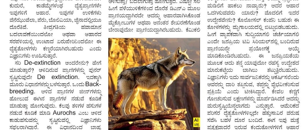 ಇತ್ತೀಚೆಗೆ ಅಮೆರಿಕಾದ ಬಯೋಟೆಕ್ನಾಲಜಿ ಕಂಪನಿ ಕೊಲೋಸಲ್ ಬಯೋಸೈನ್ಸ್ ಸುಮಾರು ಹನ್ನೆರಡು ಸಾವಿರ ವರುಷಗಳ ಹಿಂದೆ ಅಳಿದುಹೋಗಿದ್ದ Dire Wolf ಅಂದರೆ ದೈತ್ಯ ತೋಳಗಳನ್ನು ಮರುಸೃಷ್ಟಿಸುವ(De-extinction) ಮೂಲಕ ಜಗತ್ತಿನಾದ್ಯಂತ ಸುದ್ದಿ ಮಾಡಿದೆ. ನೀವು Games Of Thrones ಸಿರೀಸ್ ನೋಡಿದ್ದರೆ ಅಲ್ಲಿ ಮನುಷ್ಯರಿಗಿಂತ ಎತ್ತರಕ್ಕಿದ್ದ ಈ ದೈತ್ಯ ತೋಳಗಳನ್ನು ಕಾಣಬಹುದು. ನಿಜರೂಪದಲ್ಲಿ ತೀರಾ ಅಷ್ಟಲ್ಲದಿದ್ದರೂ ಇಂದಿನ ತೋಳಗಳಿಗಿಂತ ಅವು ಬಹಳ ದೊಡ್ಡ ಆಕಾರದಲ್ಲಿದ್ದವು. ೧೨ ಇಂಚುಗಳಷ್ಟು ಉದ್ದದ ತಲೆಬುರುಡೆ, ೬೦ಕೆಜಿ ತೂಕ, ಶೀತಪ್ರದೇಶಕ್ಕೆ ಸೂಕ್ತವಾದ ಚರ್ಮ ಹೊಂದಿದ್ದವು. ಇವುಗಳ ಪಳಯುಳಿಕೆಗಳು ಕ್ಯಾಲಿಫೋರ್ನಿಯಾದ ಗೋಮಾಳದಲ್ಲಿ ಸಾಕಷ್ಟು ದೊರೆತಿವೆ. ಒಂದೇ ಪ್ರದೇಶದಲ್ಲಿ ಅನೇಕ ತೋಳಗಳ ಮೂಳೆ ಸಿಕ್ಕಿರುವುದರಿಂದ ಇವು ಸದಾ ಗುಂಪಿನಲ್ಲಿರುತ್ತಿದ್ದು ಗುಂಪು ಗುಂಪಾಗಿ ದಾಳಿ ಮಾಡುತ್ತಿದ್ದವು ಎಂದು ಹೇಳಬಹುದು. ಕುದುರೆ, ಕಾಡೆಮ್ಮೆಗಳಂತಹ ದೈತ್ಯಪ್ರಾಣಿಗಳೇ ಇವುಗಳಿಗೆ ಆಹಾರ. ಇವುಗಳ ಉಳಿಕೆಗಳು ವೆನೆಝುವೆಲಾ, ಪೆರು, ಬೊಲಿವಿಯಾ, ಚೈನಾದಲ್ಲಿಯೂ ದೊರೆತಿವೆ. ತೀವ್ರಗತಿಯ ಹವಾಮಾನ ಬದಲಾವಣೆಯಿಂದಲೋ, ಆಹಾರದ ಸರಪಳಿಯಲ್ಲಿ ಉಂಟಾದ ಏರುಪೇರಿನಿಂದಲೋ ಈ ದೈತ್ಯತೋಳಗಳು ಕಣ್ಮರೆಯಾಗಿರಬಹುದು ಎಂದು ವಿಜ್ಞಾನಿಗಳು ಊಹಿಸುತ್ತಾರೆ.